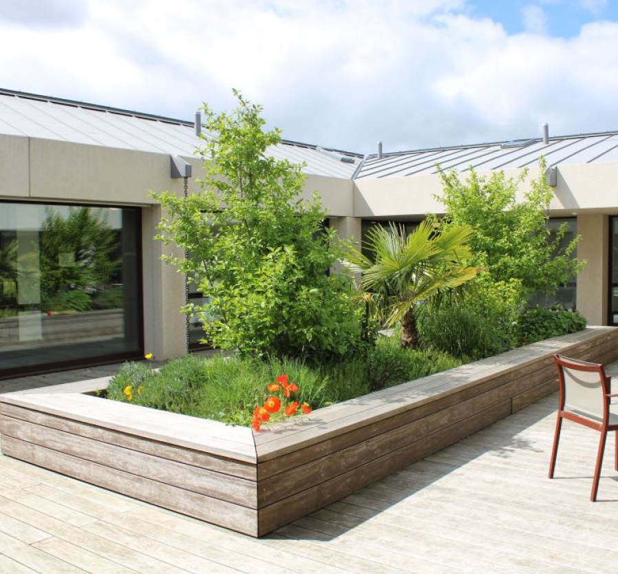Les deux ailes du bâtiment forment un lemniscate (forme en 8) qui s'ouvrent sur un patio arborisé à chaque étage.